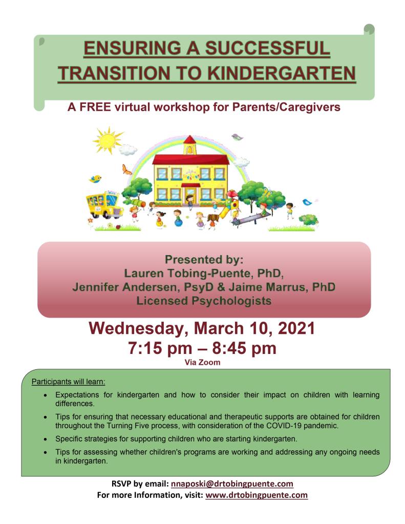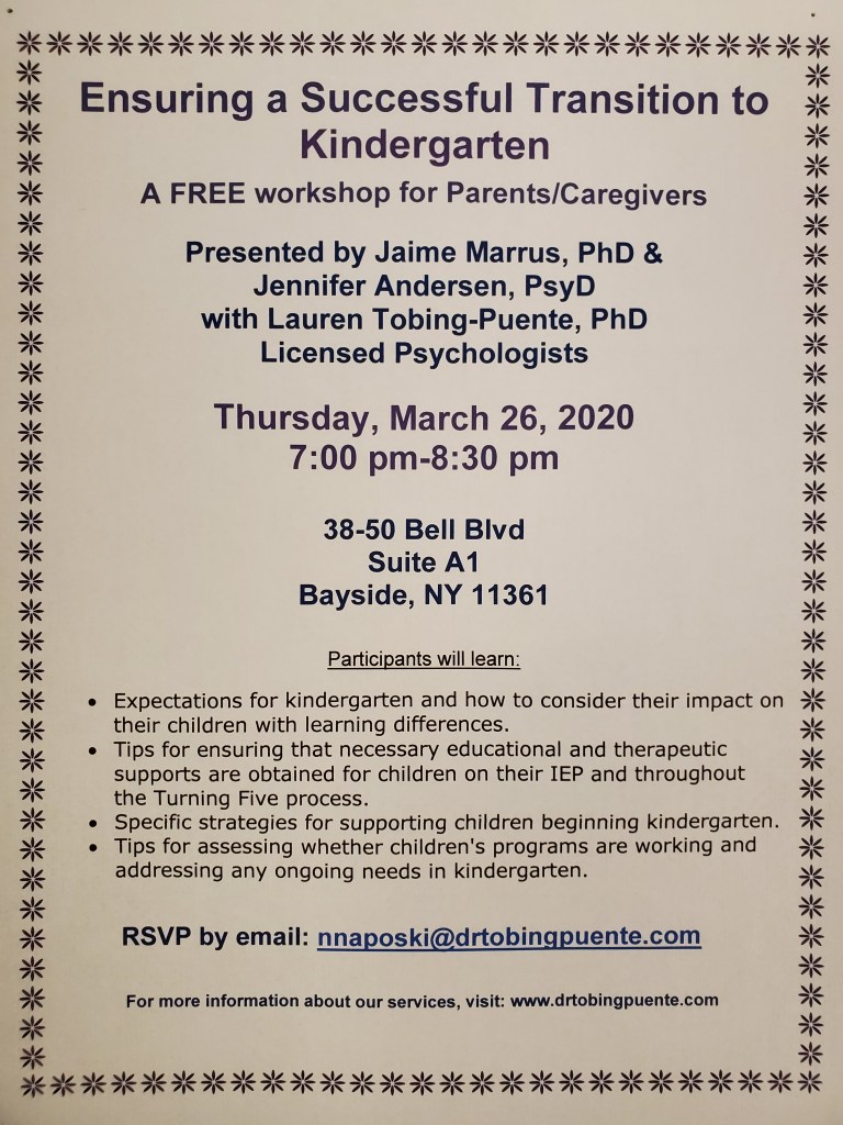 Our annual presentation, Ensuring a Successful Transition to Kindergarten will be held at our Bayside office. Please RSVP to nnaposki@drtobingpuente.com.