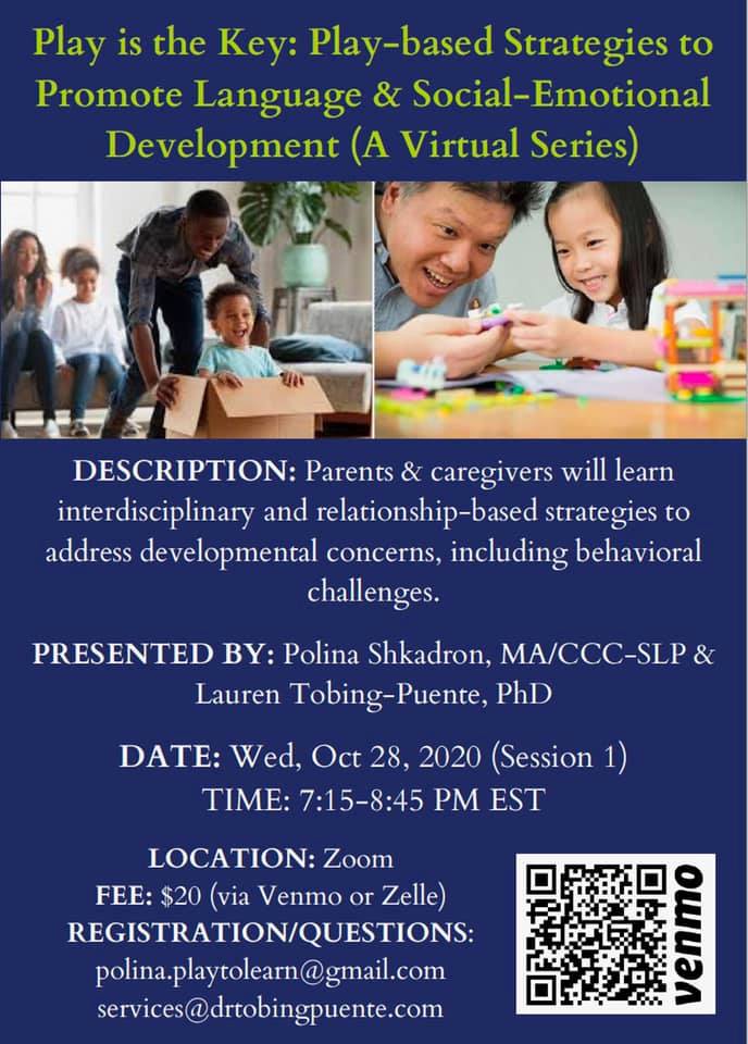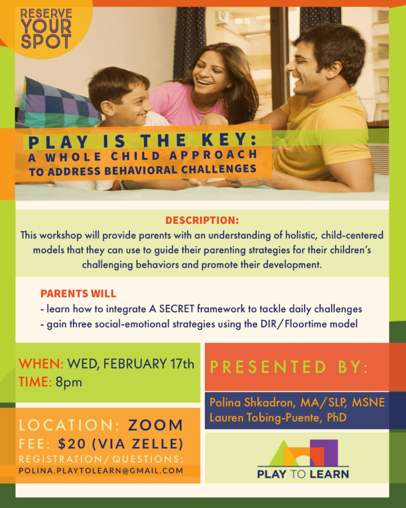 The next parent workshop in our Play is the Key series will be RESCHEDULED. PLEASE STAY TUNED FOR NEW DATE TBA SOON held on Wednesday, February 17, 2021 at 8:00pm via Zoom! Polina Shkadron and Dr. Lauren will be discussing holistic, child-centered, relational frameworks that provide parents with parenting strategies to address children’s challenging behaviors and promote their development. Please email: polina.playtolearn@gmail.com to register.