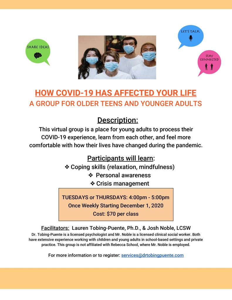 We are excited to announce the start of a new virtual ongoing class for older teens and young adults! Dr. Lauren and Josh Noble, LCSW will be running this weekly group to teach individuals coping skills and ways of processing their COVID-19 experiences. For more information or to register, click here.