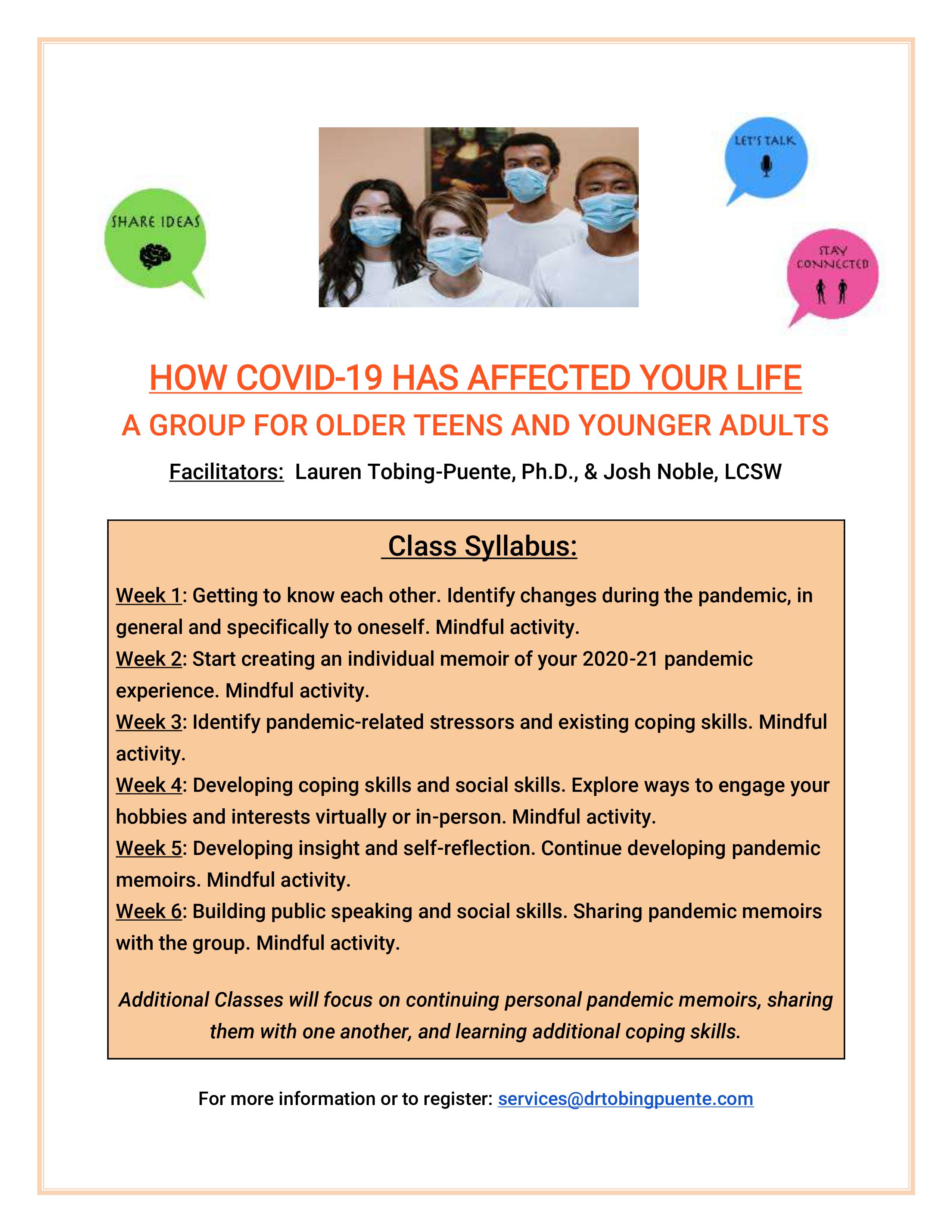 Dr. Lauren and Josh Noble, LCSW are excited to launch their new COVID-19 classes for older adolescents and young adults. Check out the initial syllabus below!