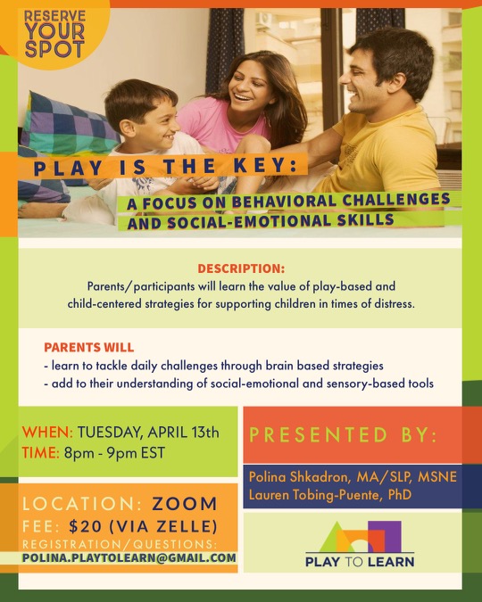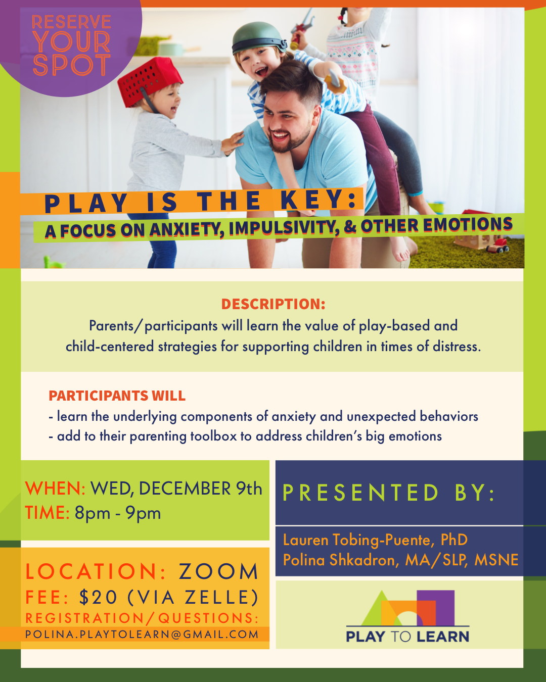 The next parent workshop in our Play is the Key series will be held on December 9 via Zoom and will focus on anxiety, impulsivity and challenging behaviors. Polina Shkadron and Dr. Lauren are looking forward to it! Please email: polina.playtolearn@gmail.com to register.
