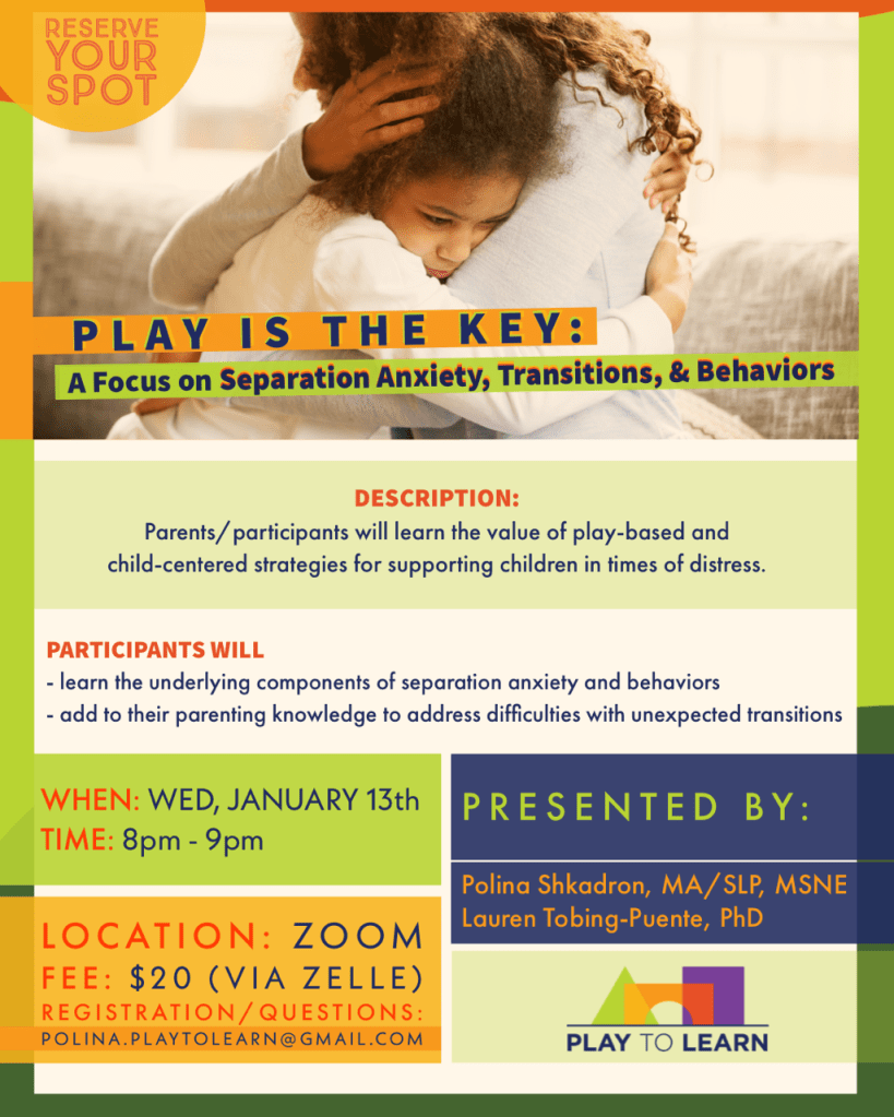 The next parent workshop in our Play is the Key series will be held on January 13, 2021 via Zoom and will focus on separation anxiety, transitions, and behaviors, including within the COVID-19 pandemic. Polina Shkadron and Dr. Lauren are looking forward to it! Please email: polina.playtolearn@gmail.com to register.