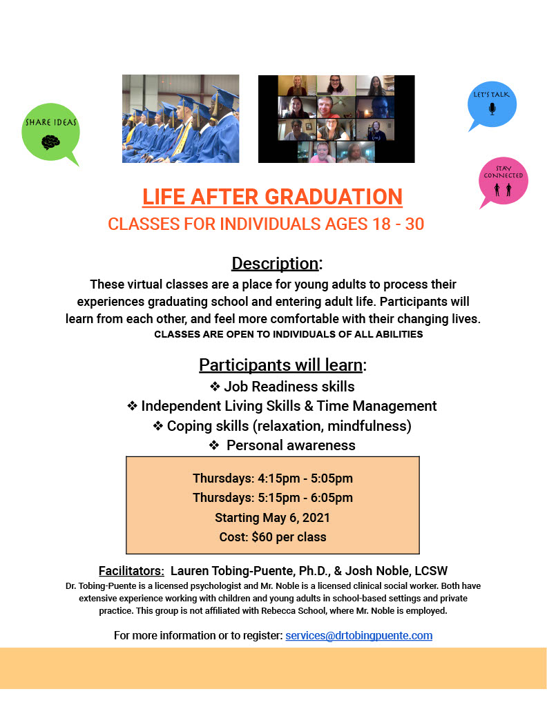 Dr. Lauren and Josh Noble, LCSW are excited to launch a new “Life After Graduation” class for older adolescents and young adults. This class (initial session: May 6-June 17) is open to individuals of all abilities and will support them as they transition from the structure of school life to greater independence in young adulthood.