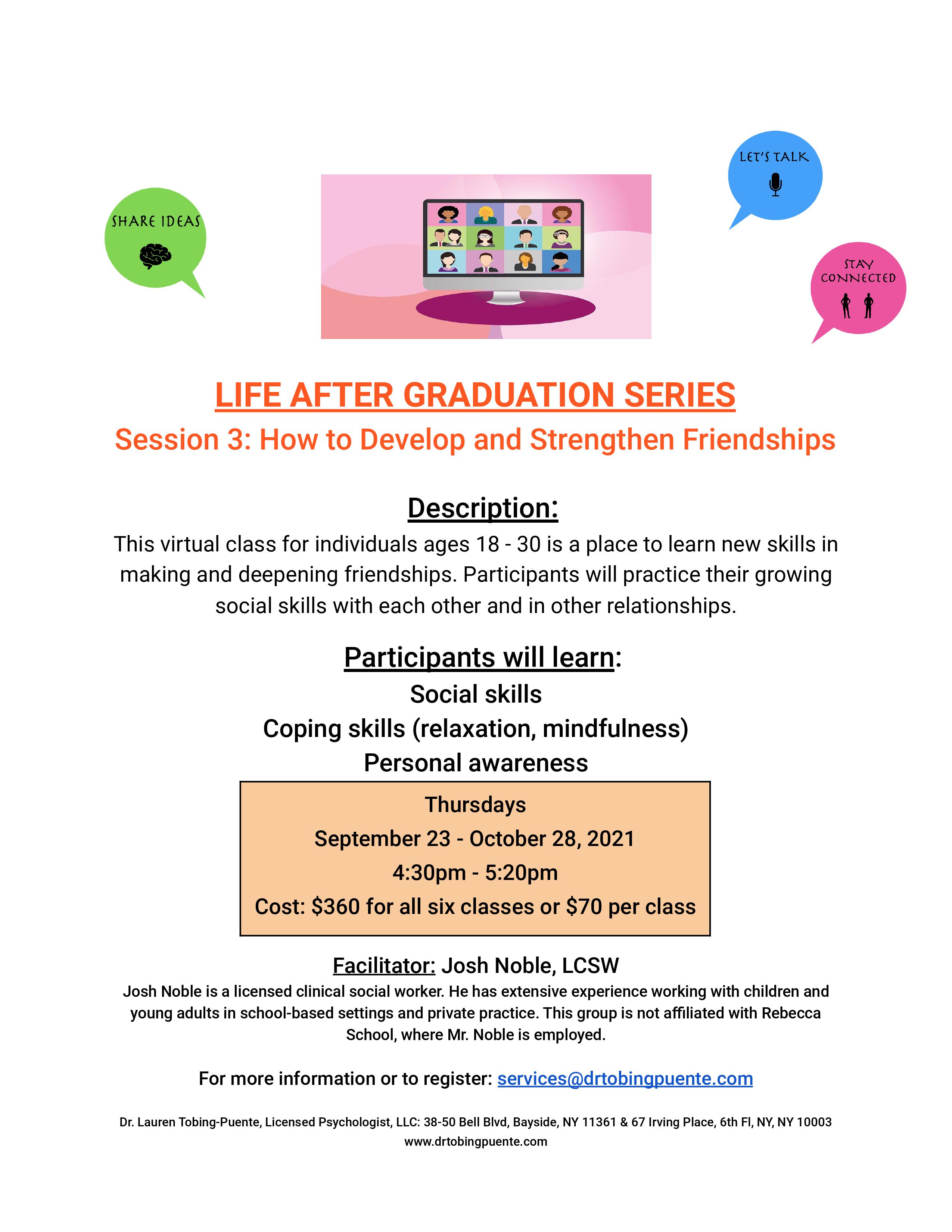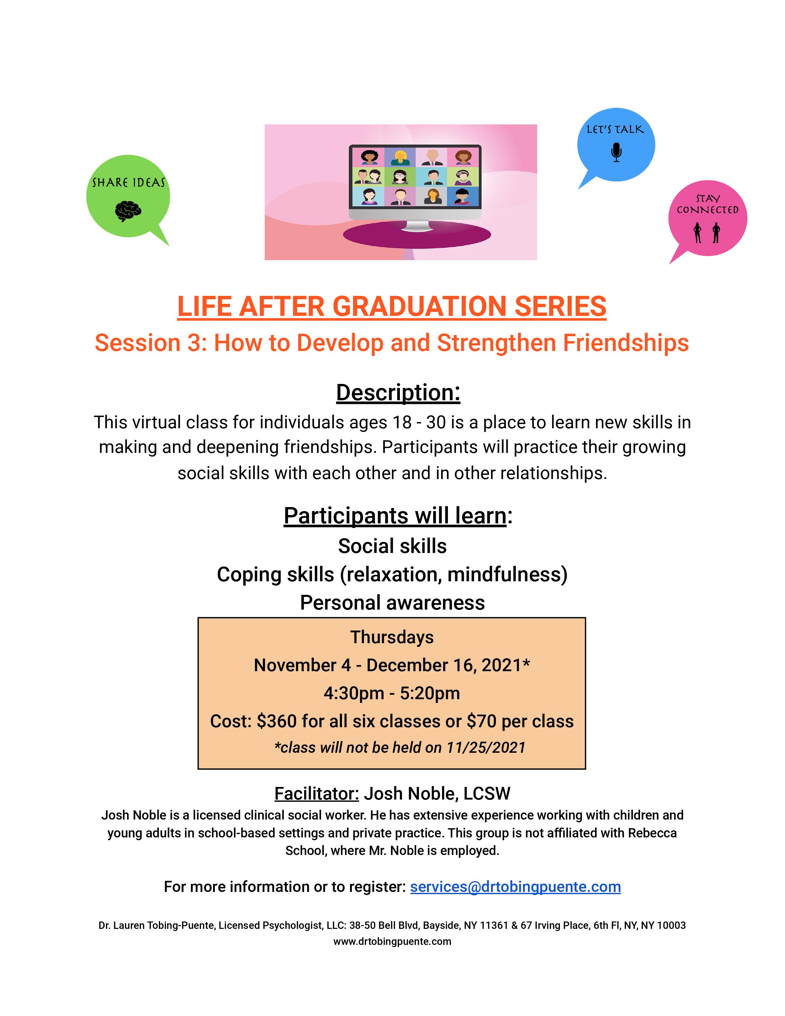 Great News! Josh Noble’s next session of “Life After Graduation” classes, “How to Develop and Strengthen Friendships” is starting on Thursday, November 4, 2021! This class is open to individuals of all abilities (ages 18-30) and will support them as they navigate social relationships during young adulthood.