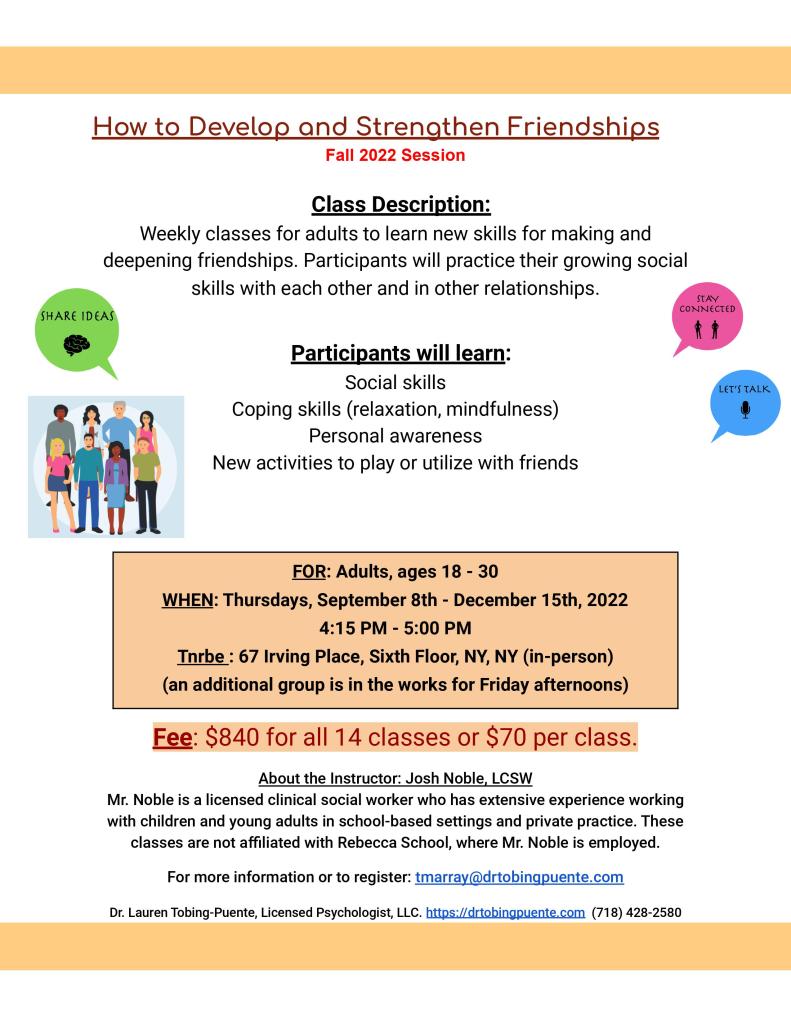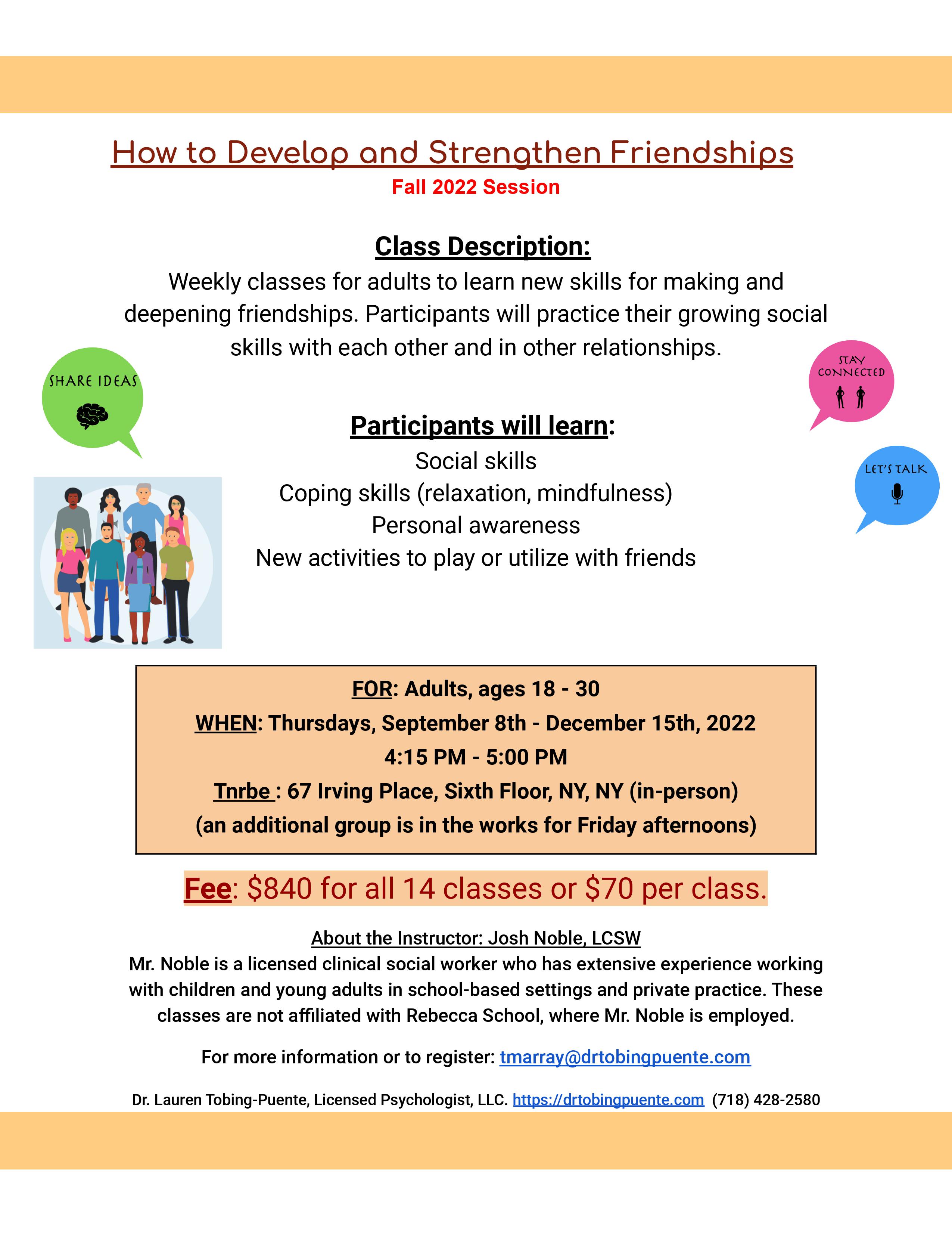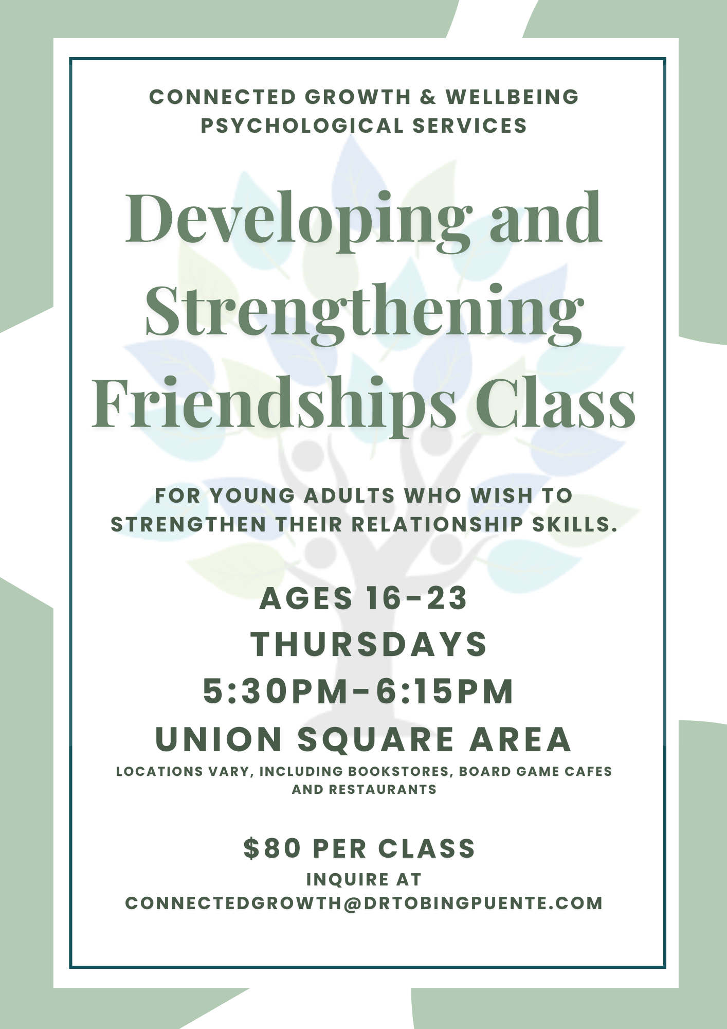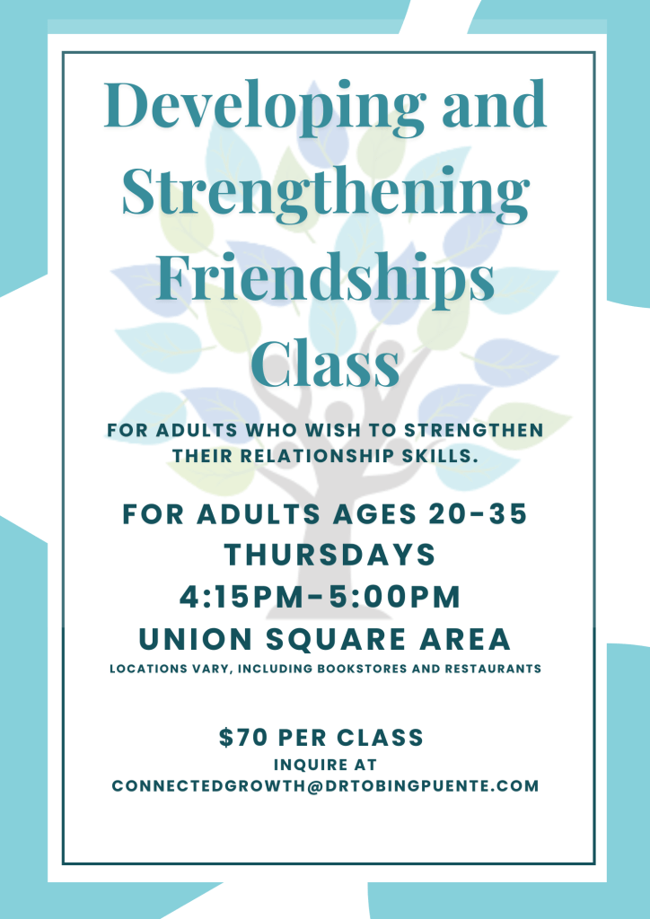 Interested in strengthening your relationship skills, or know someone who might be? Josh Noble’s Developing and Strengthening Friendships Class meets every week in the Union Square area. You can view our updated curriculum here, or inquire with connectedgrowth@drtobingpuente.com. Currently meeting Thursdays at 4:15PM!