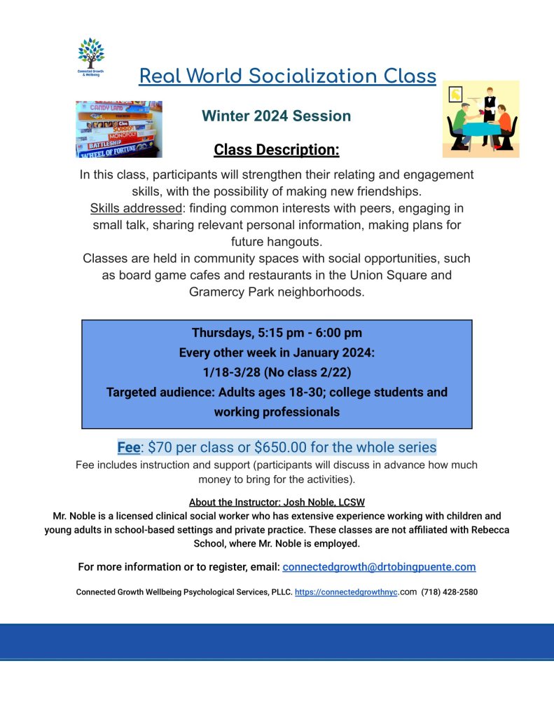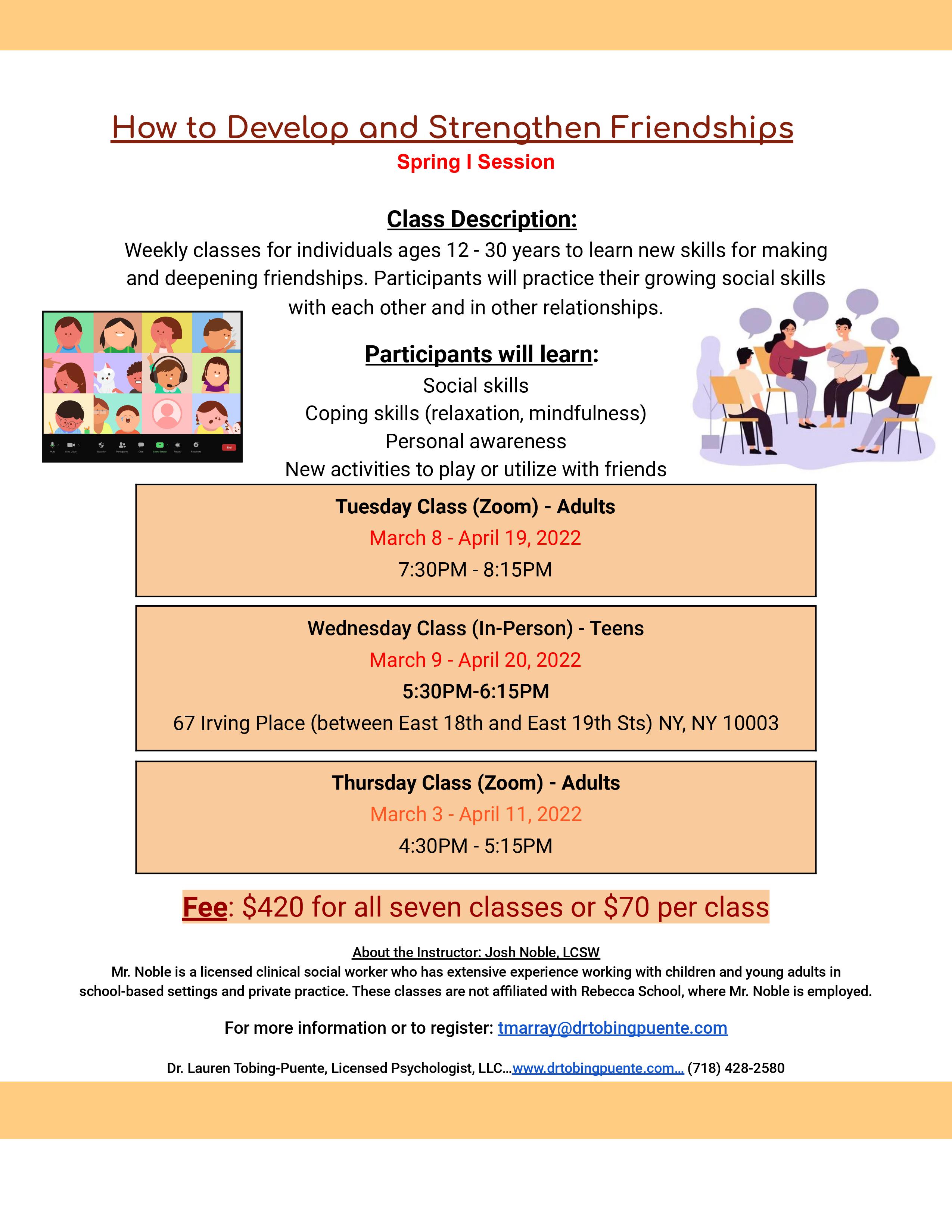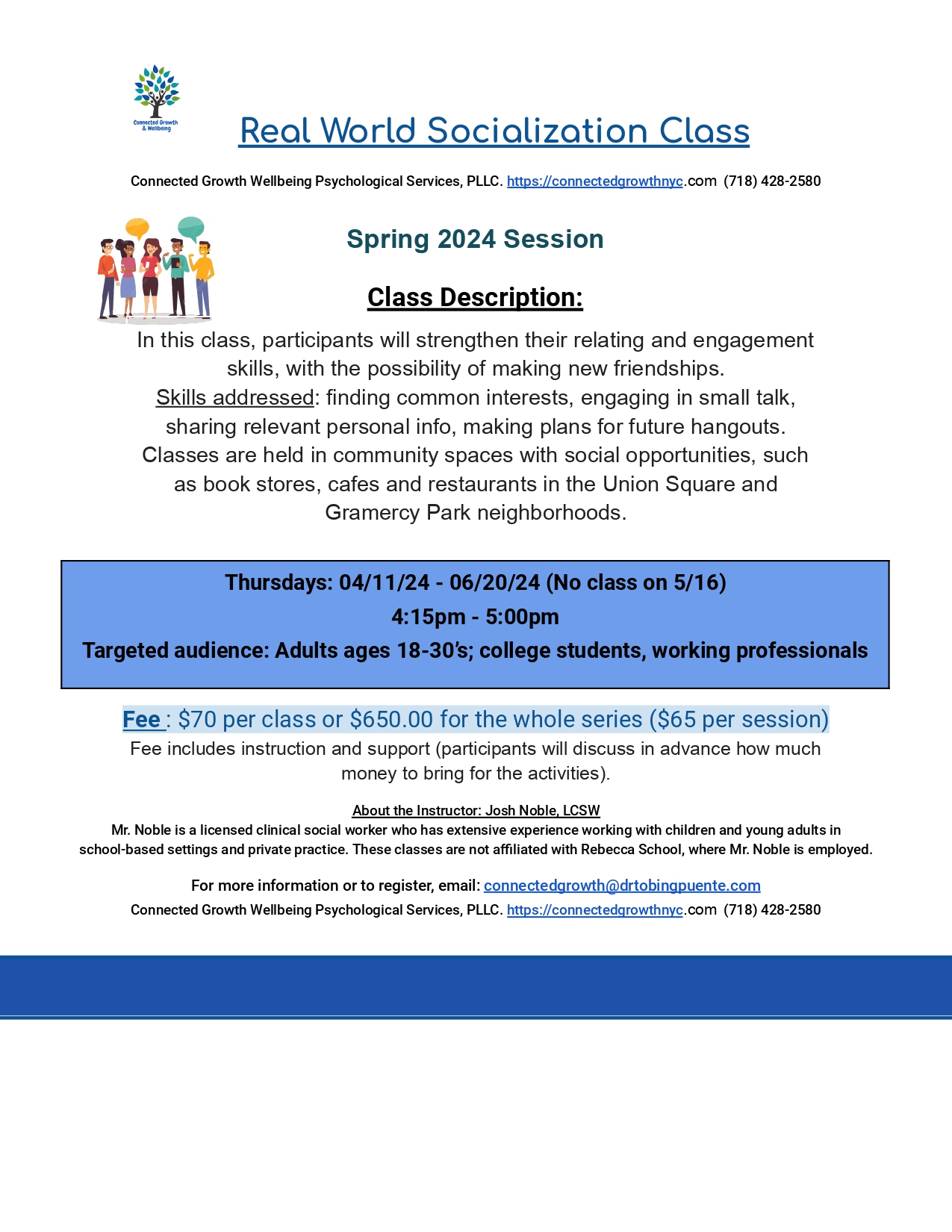 Interested in strengthening your relationship skills, or know someone who might be? Josh Noble’s Developing and Strengthening Friendships Class meets every week in the Union Square area. You can view our updated curriculum here, or inquire with connectedgrowth@drtobingpuente.com. Currently meeting Thursdays at 4:15PM!