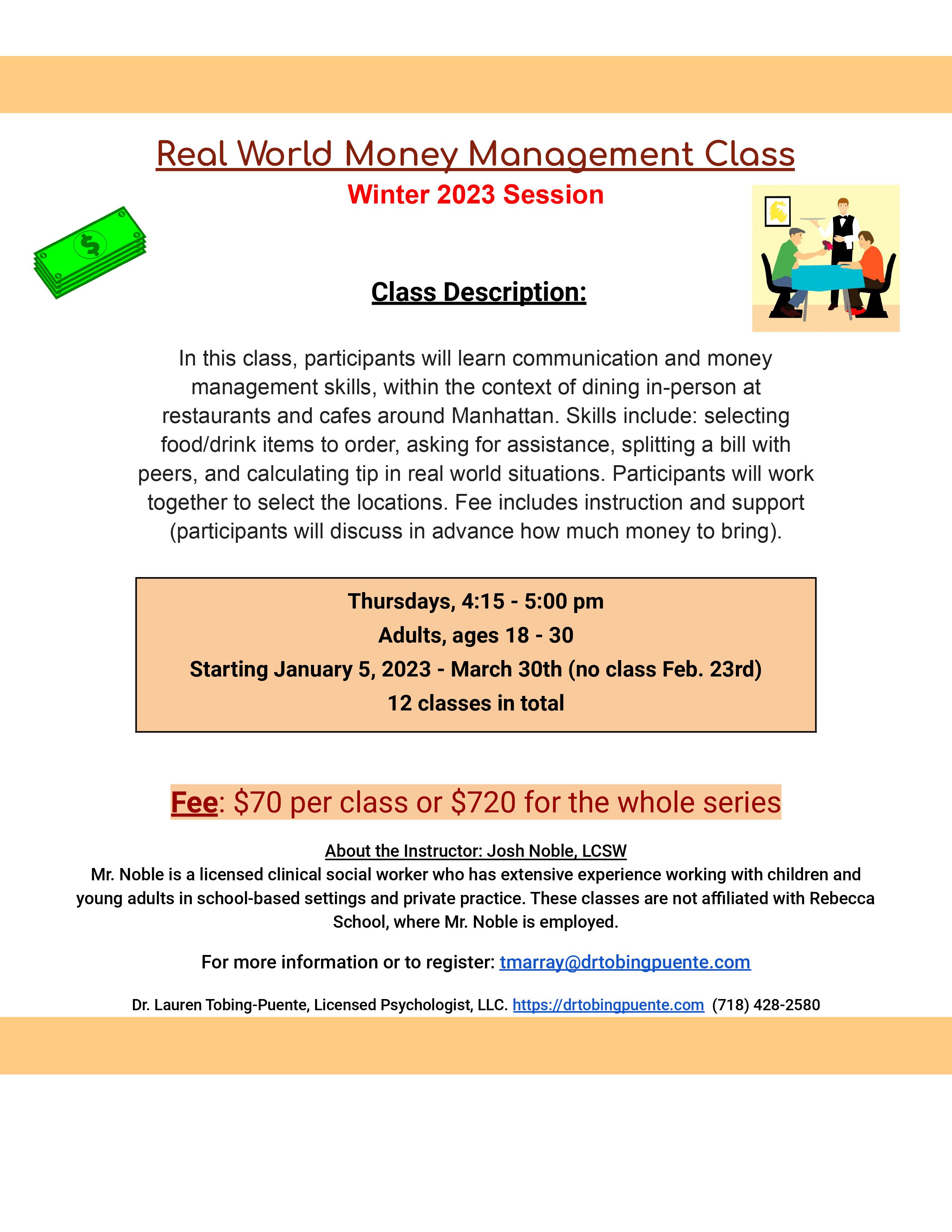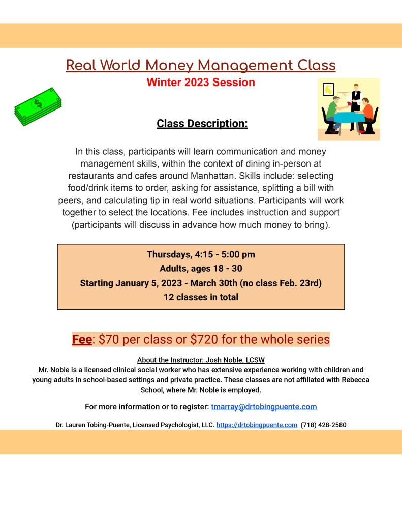 We proudly announce the start of our Winter 2023 semester of Real World Money Management Classes in-person for young adults ages 18-30!