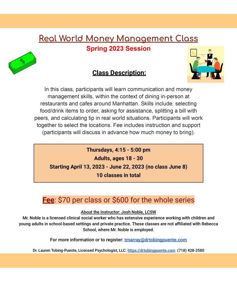 We proudly announce the start of our Spring 2023 semester of Real World Money Management Classes in-person for young adults ages 18-30!